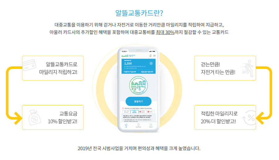 알뜰교통카드란 대중교통을 이용하기 위해서 걷거나 자전거로 이동한 거리만큼을 마일리지로 적립하여 지급해주는 카드입니다.