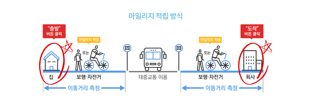 마일리지 적립 방식은 대중교통을 이용하기 전·후의 보행이나 자전거로 이동한 거리만큼 마일리지를 정립해주는 것입니다. 즉, 알뜰교통카드는 기존 대중교통 할인카드와 연계되어 플러스적으로 마일리지를 적립해줌으로써 교통비를 절감해주는 카드입니다.