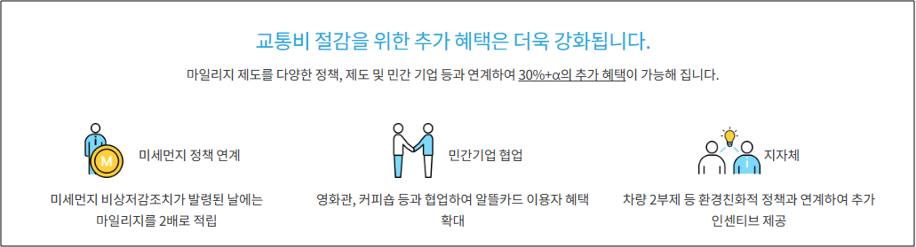 또한 3월에 회당 마일리지 적립액이 상향하고, 7월엔 마일리지 적립횟수도 기존 상한 44회에서 60회로 상향시킨 알뜰교통카드 플러스를 발행할 예정으로, 지금과 같은 고물가 시기에 대중교통을 이용하는 국민들의 교통비 절감에 큰 도움을 주는 카드입니다.
